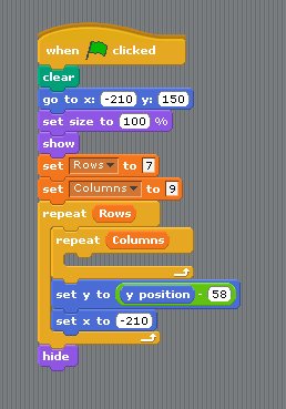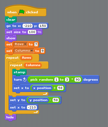 We now need a two loops (repeat blocks) one inside the other, I did the columns inside the rows, if you do this it will make it easier. For each column we need to STAMP the Sprite and for each Row we need to go back to the left of the screen and down one row.