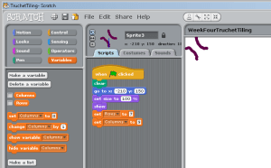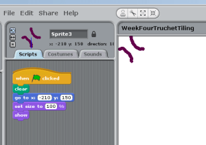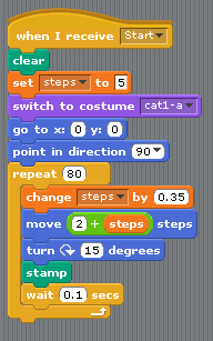 Finally you need to STAMP your Sprite and turn it round ready for the next STAMP. You will need to use a random number here, so it will turn 90, 180 or 270 degrees. So a random number between 1 and 3 multiplied by 90. Once you have the Sprite turned you will also need to move it along so it will STAMP next to the last STAMP. Again this is where you use the size of your Sprite that you noted down earlier, and once again, you might need to reduce it by a little bit in order to get the lines joining up nicely.
