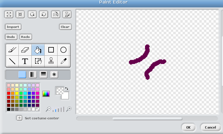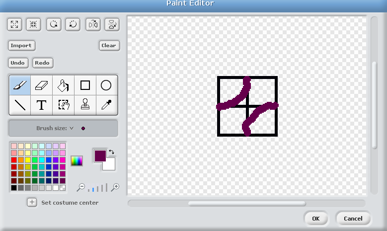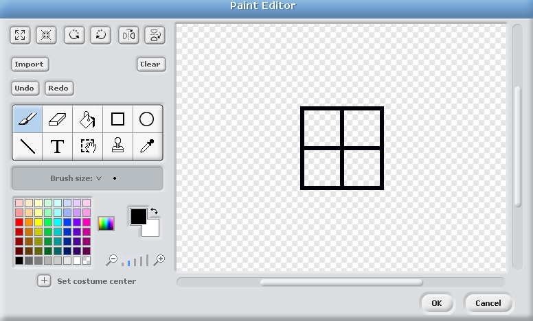 Advanced Tip 1 -If you hold down the shift key when drawing the square in the Paint Editor, Scratch will force it to be a Square, you wont have to guess. This also applies to circles, if you hold the shift key down they will be perfectly round.