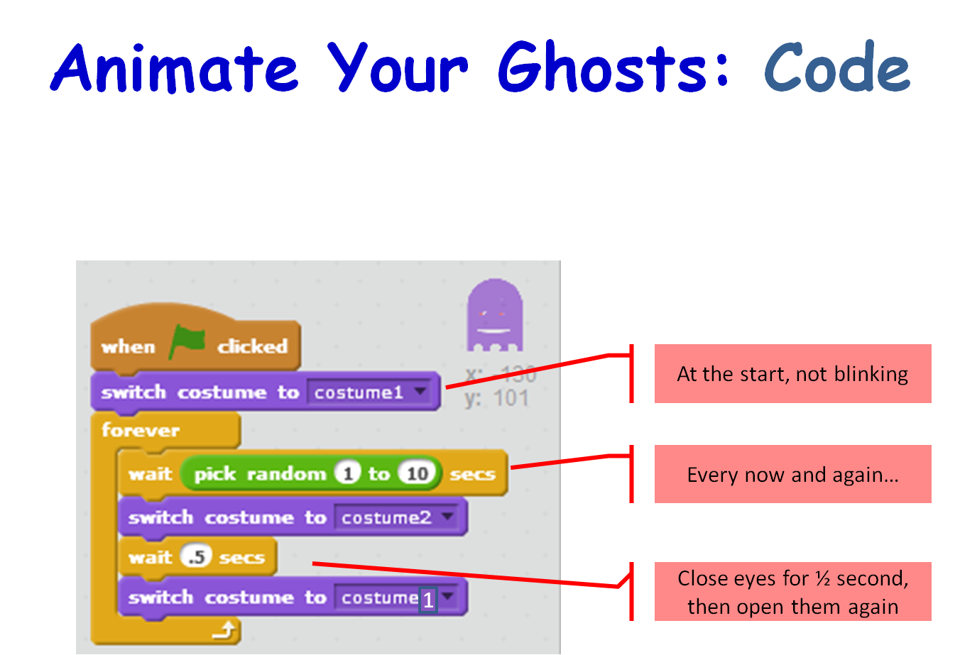 We animated our ghosts by creating a simple change costume script that runs forever,