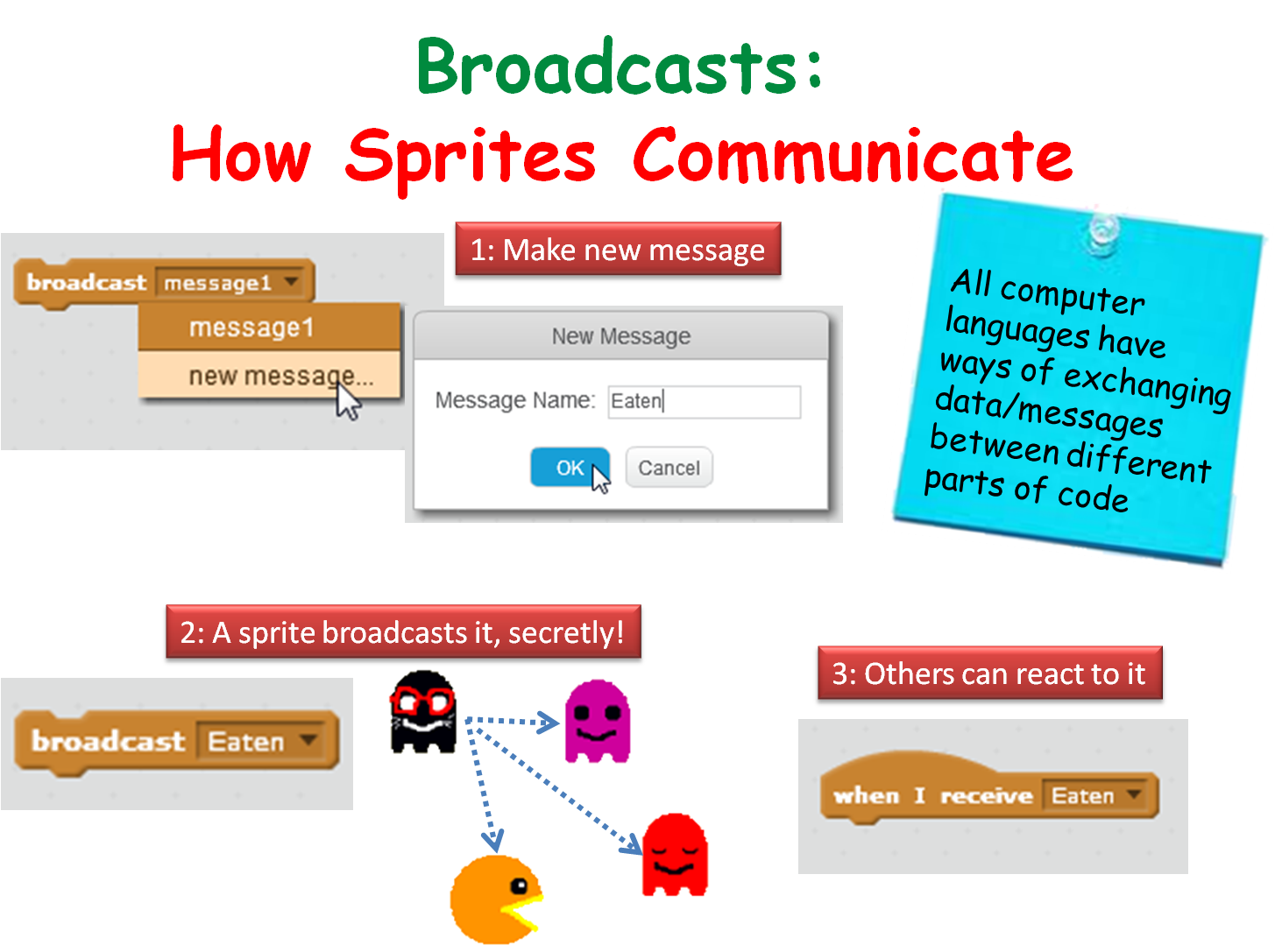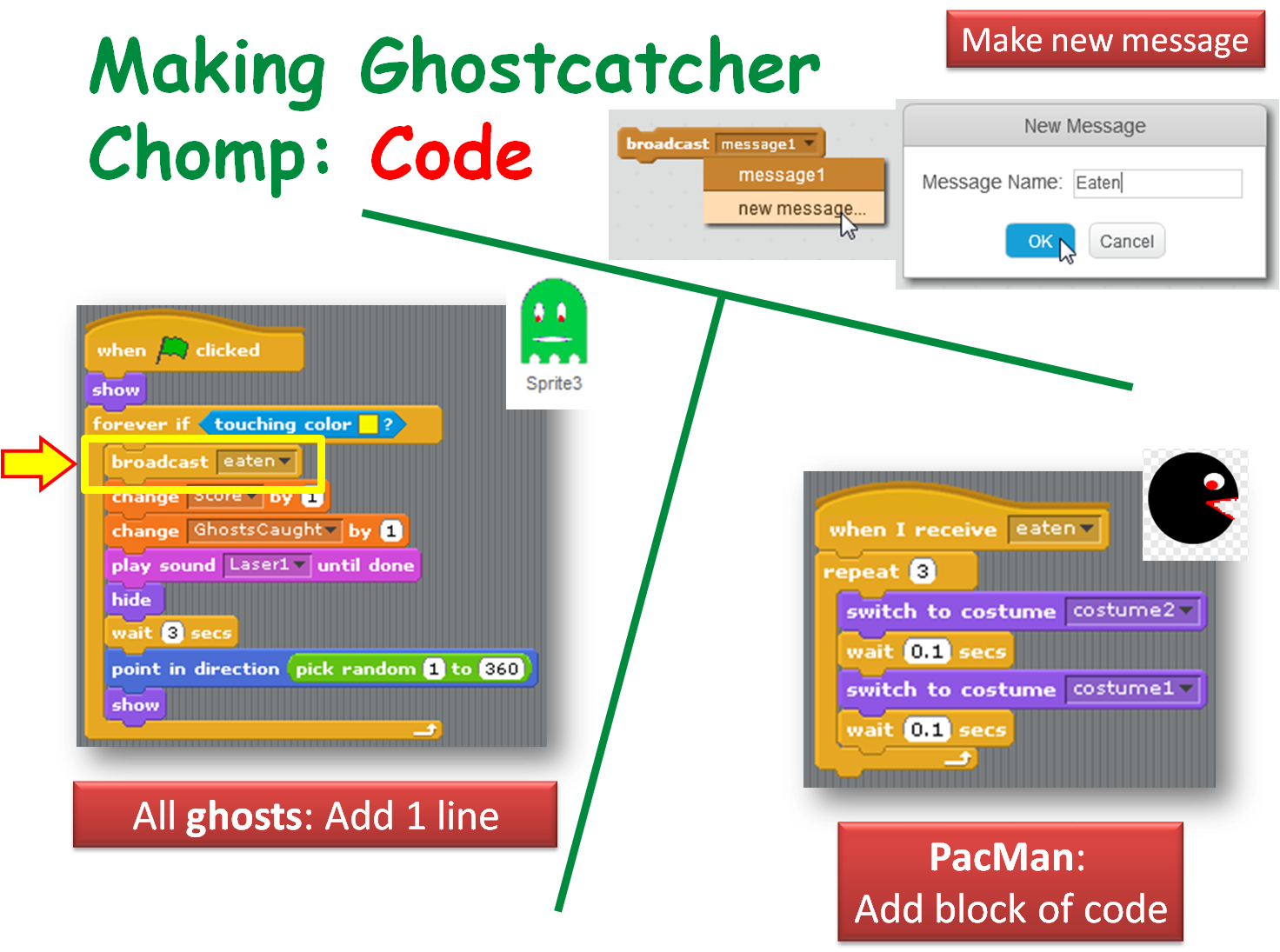 We made our ghosts broadcast a message when they are caught to make ghostcatcher (aka Bob) change his costume (Hint!: First, we made a new costume for Ghostcatcher Bob to make his mouth look closed!),