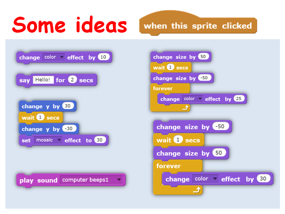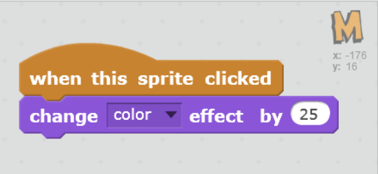 For my First letter, M, I decided that when this Letter (Sprite) was clicked, that it would change colour. Experiment to see what happens when you change the number!