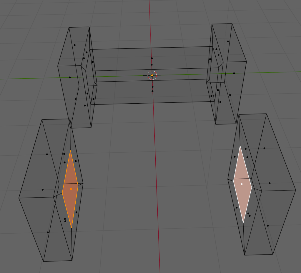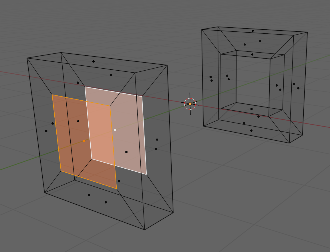 The first three of these are very familiar, but we can talk about the other two. A few places, such as around the hole in the wall cut for the window, we had a set of existing faces that could be repurposed to form the basis of another object, in that case the window itself. Duplication of faces is accomplished with the keystroke shift-d, followed by enter to confirm. The duplicates, already selected, can then be separated by pressing p and choosing “Selection”.
