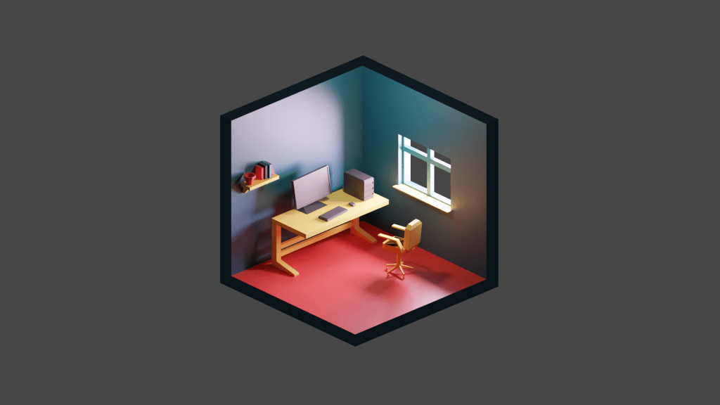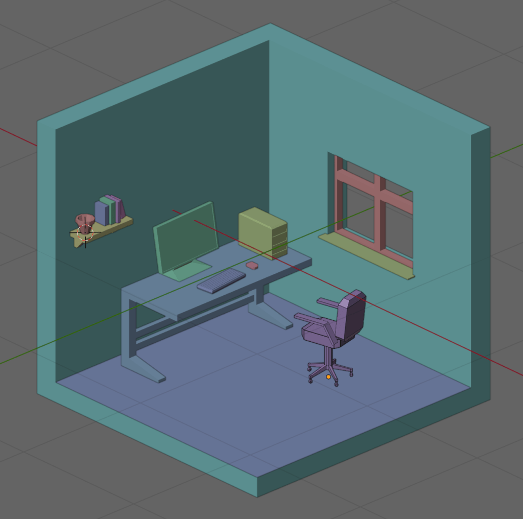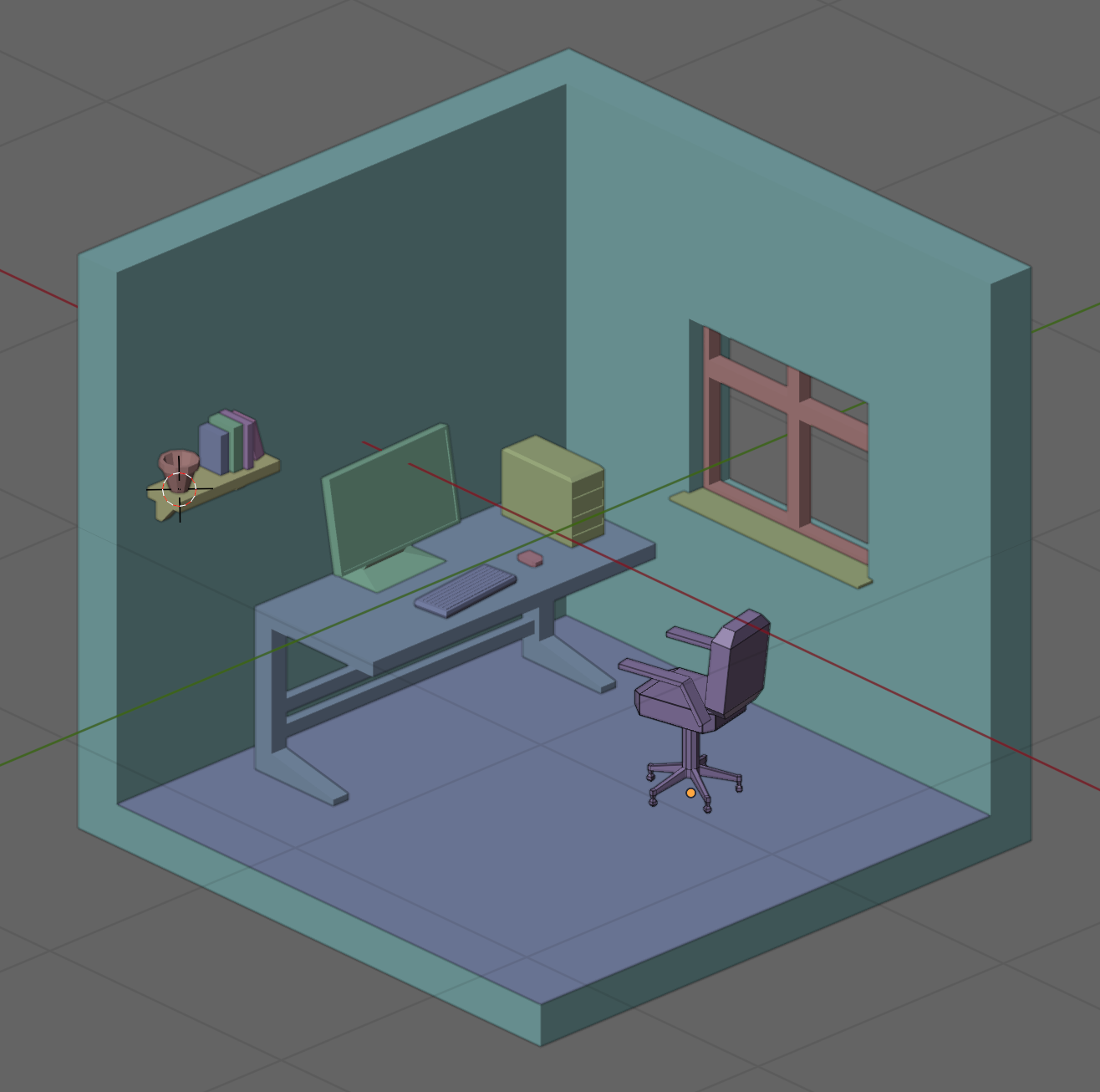 After mostly doing a review of the basic functions of Blender in Weeks 1 and 2, we started our first real project this week; a diorama of a room populated with low-poly props, rended by an orthographic camera from an isometric perspective.