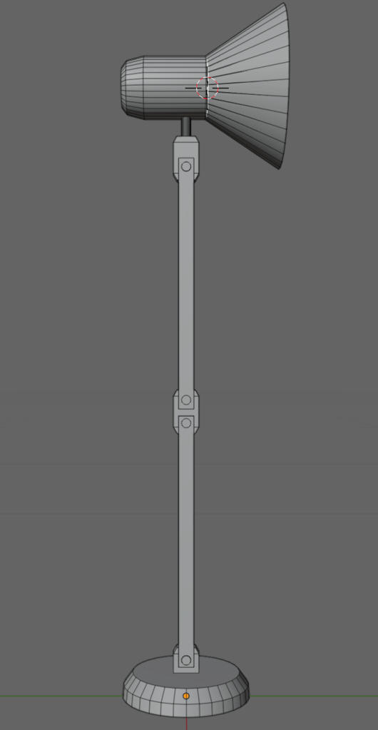 We then built a simple model of an articulated desk lamp. Built as a single mesh and composed of simple primitive objects, all starting as cylinders or cubes, we developed it initially in a completely linear vertical configuration.