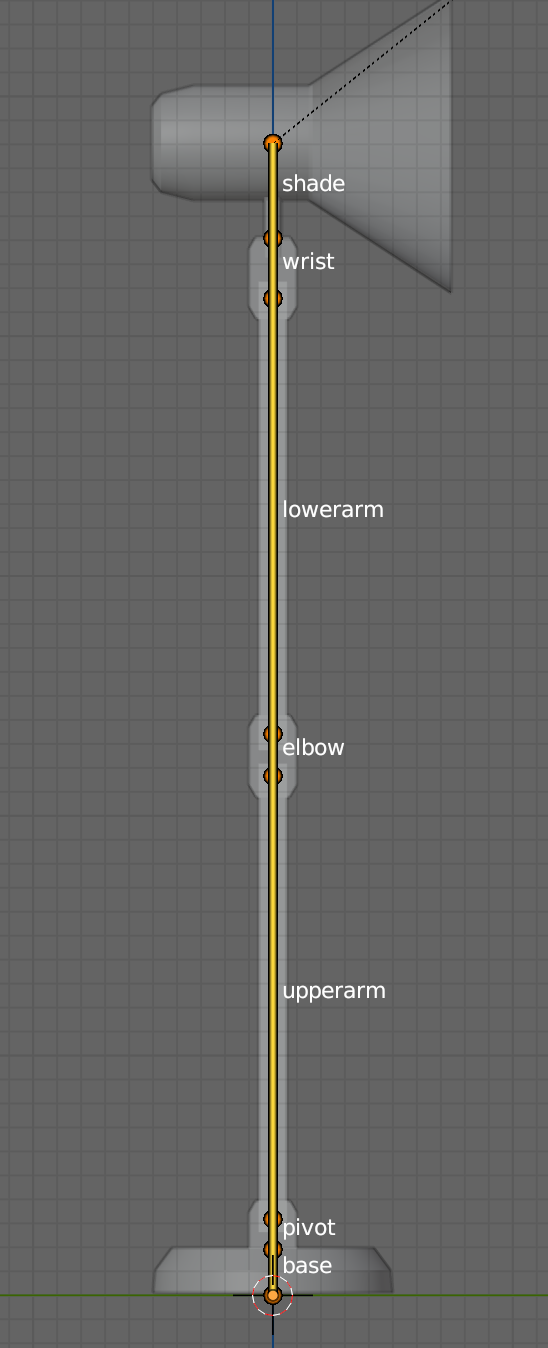 Next we generated a new armature. In edit mode, we scaled the initial bone until it was just the size of the base vertically and called it base, the name matching that of the vertex group in the lamp model. We then extruded the tip of this bone vertically to the centre of the first hinge pin in the model. This bone was named pivot again matching the name of the corresponding vertex group. We repeated this until there was a bone, named for the corresponding vertex group, across each section of the model.
