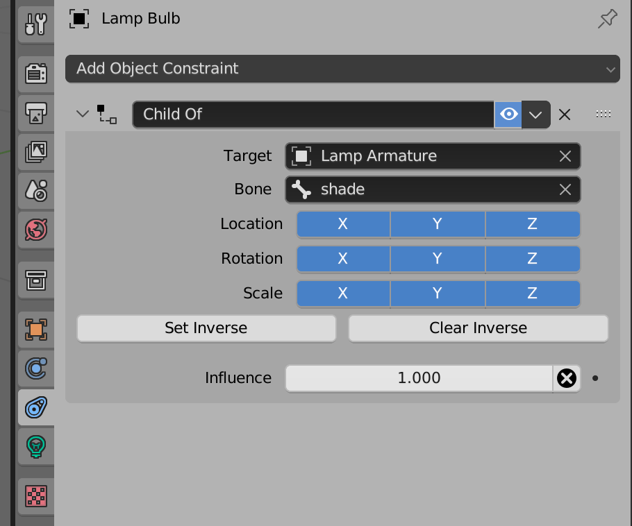 We then wanted to move the light with the armature as well, as it currently remained in space where we’d located it originally. To do this we selected the spotlight object and added an object constraint tying it to the the shade bone in the armature, as shown below. This moved the light, so we needed to reposition and rotate it again to get it in the correct location.