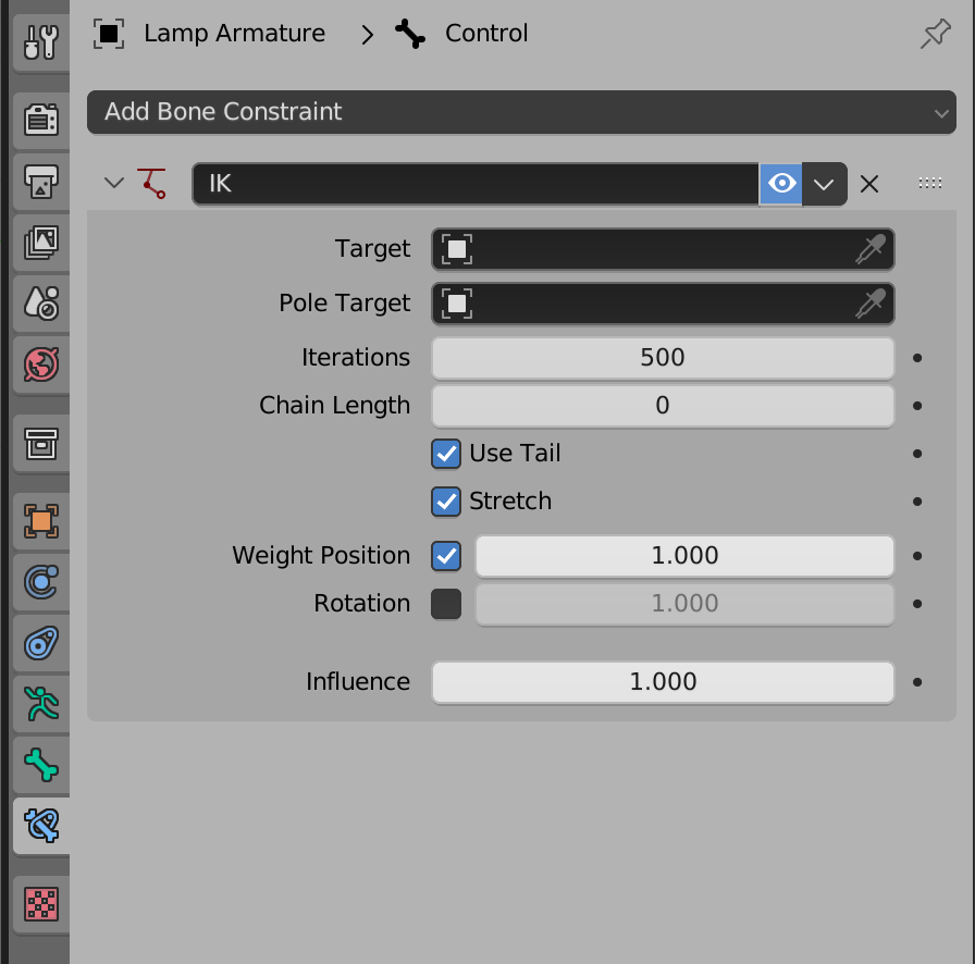 We then switched to pose mode. Once in pose mode, we could add an IK constraint to the control bone as shown below. All defaults here are fine in this case.