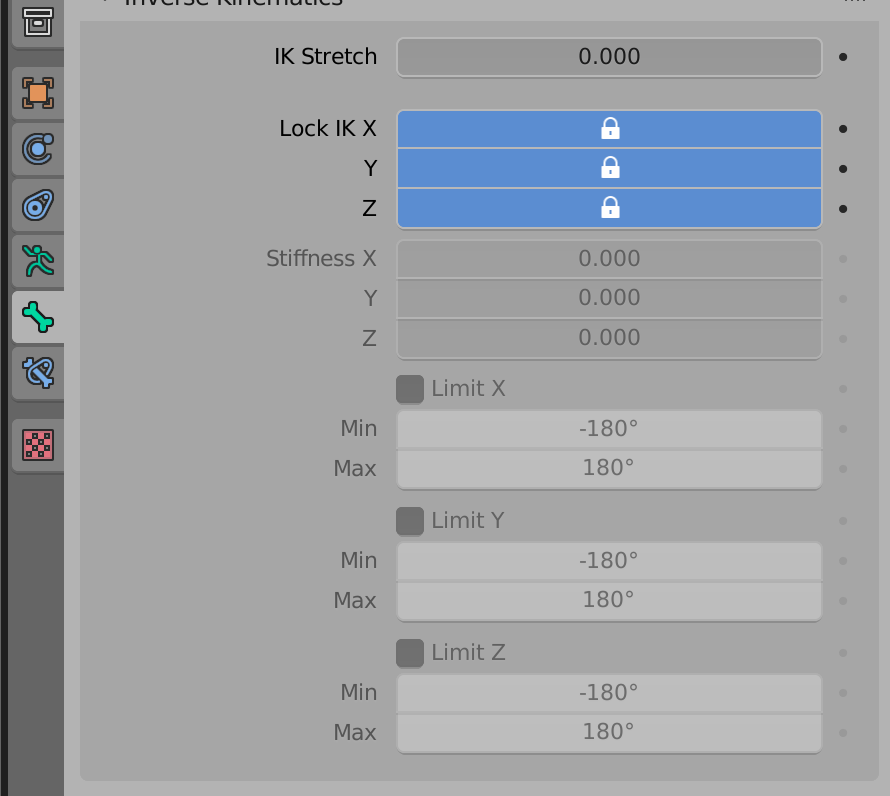 Then we saw that moving this bone in Pose mode caused the rest of the lamp to follow, however some parts of the lamp were moving in ways we didn’t want. The final step was to place some IK limits on certain bones in the Bone Properties Panel. For the base we locked x, y and z because we didn’t want it to rotate at all: