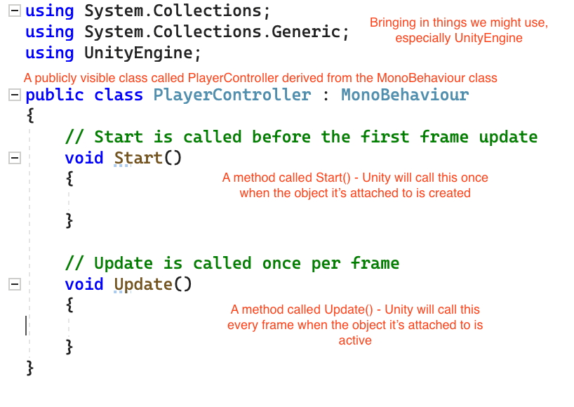 Double-clicking on the name of the script file (PlayerControllerX.cs) in the inspector allows us to open it. The code for moving the plane is in the Update() method: