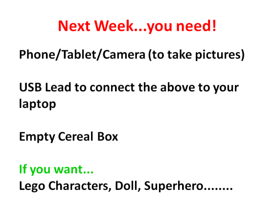 This coming week is the last one before our midterm break. I am going to show you a couple of techniques for showing movement. We will use costumes for the Sprites and it will be Halloween based.