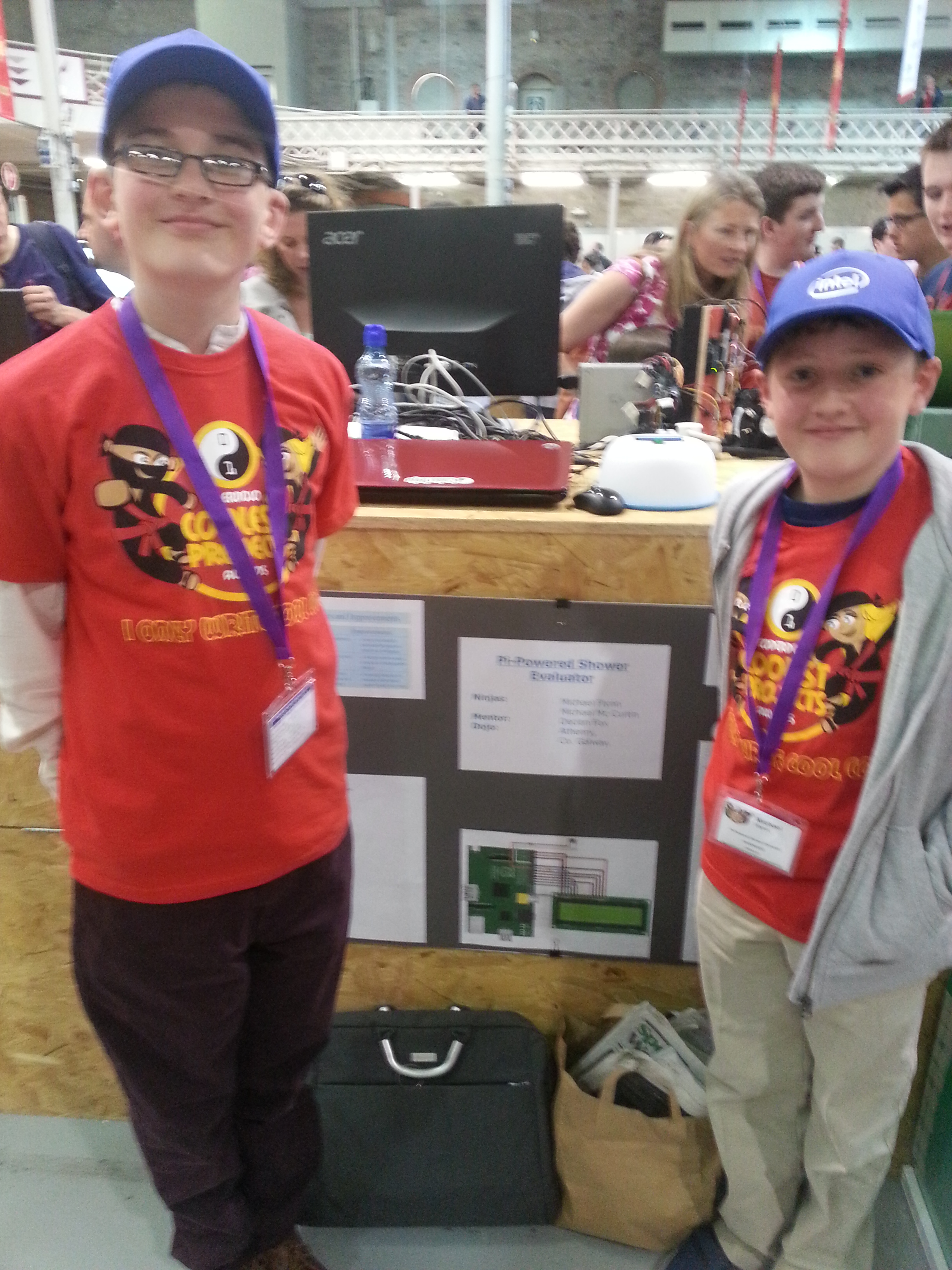 Michael and Mikey from the CoderDojo Athenry PiDojo who entered their clever and topical Shower Evaluator project that times your shower and displays the amount of water used, cost of water, and cost of energy: