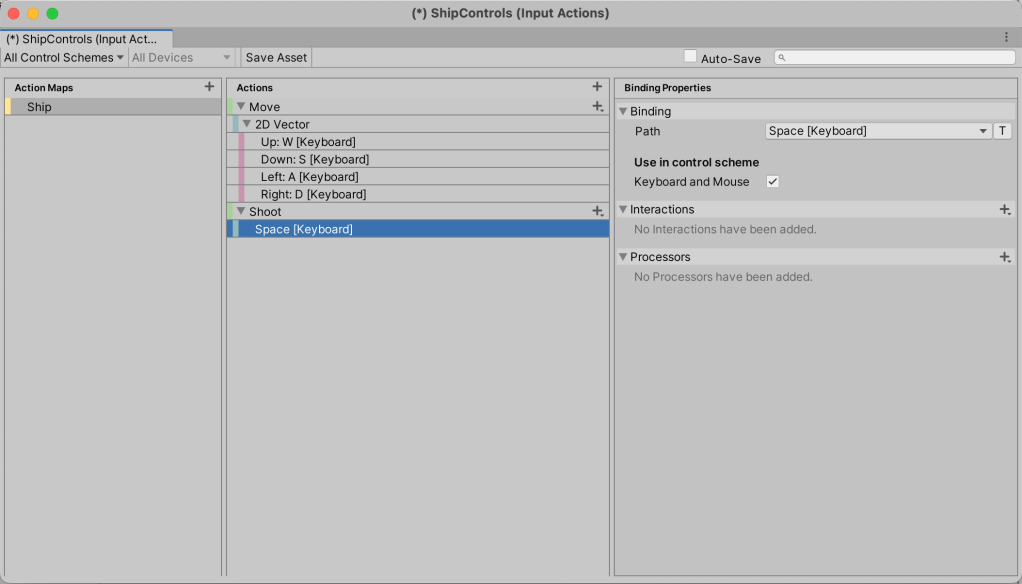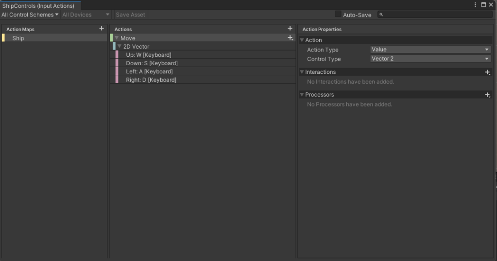 We first created a folder called Input and in there we made a new “Input Actions” asset and called it “ShipControls”. Opening this, we defined a simple control scheme, for keyboard and mouse, as follows: