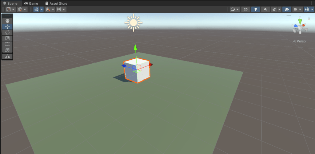 We then added a plane, which we added a material to, and a cube positioned just above the plane, to our current scene. With the cube selected, we positioned ourselves in the Scene View such that the cube’s X-axis (red) was pointing right and away from us and the cube’s Z-axis (blue) was pointing left and away from us.