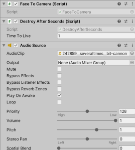 To that we added a DestroyAfterSeconds component with a Time To Live of one second and an AudioSource component where the clip was set to our explosion sound, Play on Awake was set to true and Loop was set to false.