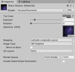 We imported a image of stars into our Textures folder. In the Material folder we created a new Material called StarsSkybox. We changed the Shader to Skybox/Panoramic and assigned our stars image to the Spherical (HDR) slot. We also changed Image Type to 180 degrees.