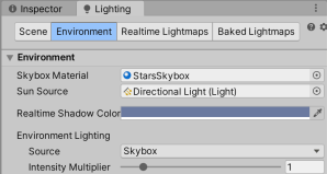 To assign this skybox to our scene, we used the Window|Rendering|Lighting menu to open the Lighting dialog and set the skybox material at the top of the Environment tab.