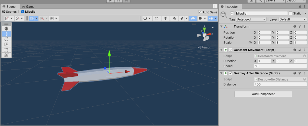 The original missile was very small, so we scaled the model part to (3, 3, 3). We then added a BoxCollider, a kinematic RigidBody and a DestroyOnContact component. For the DestroyOnContact component, we set theDestroy Prefab property to our Explosion prefab.