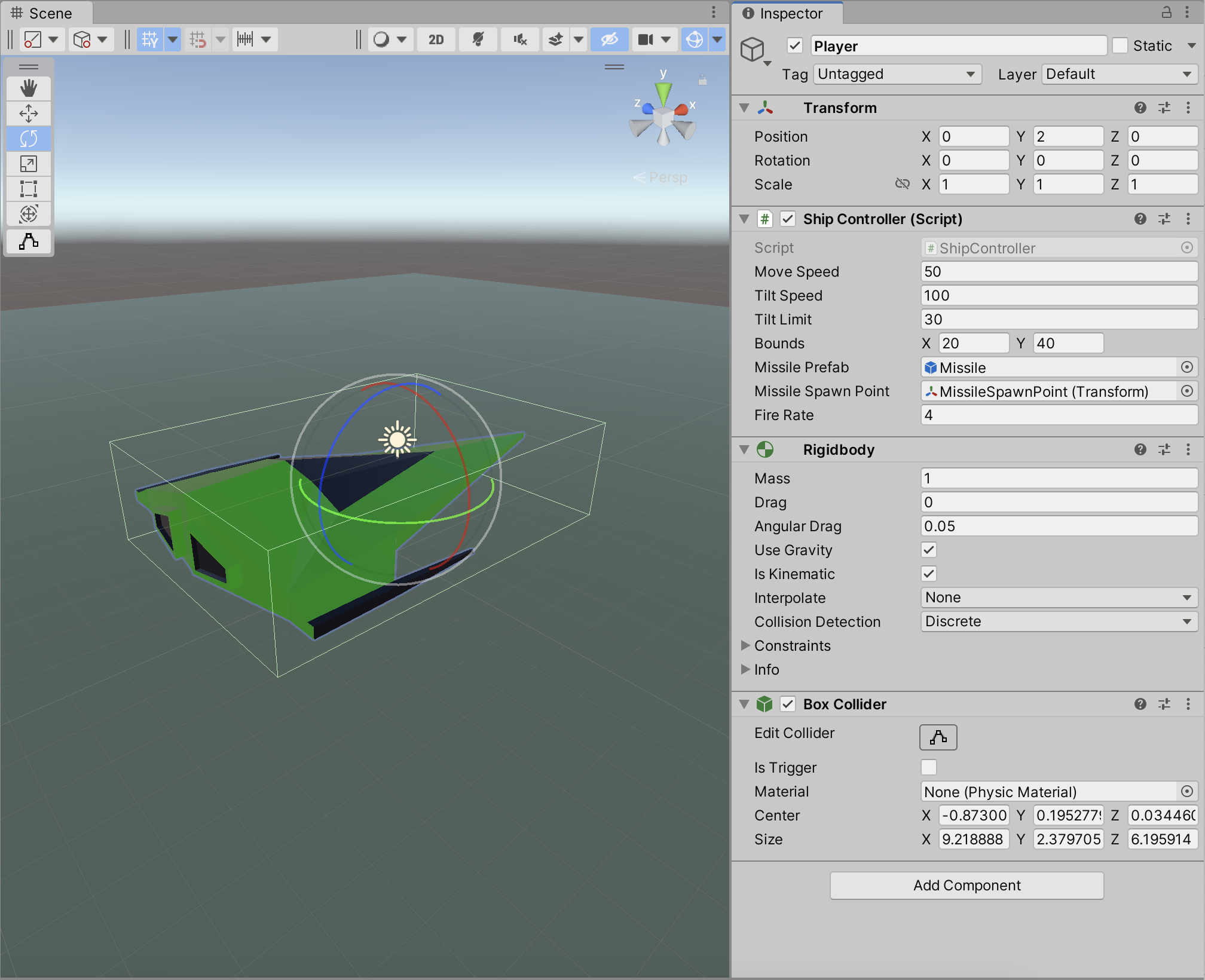 Next week we’re going to make our ship a little more ship-like in proportion and make it bank when it goes sideways. We’ll also be creating a simple ship model in Blender.