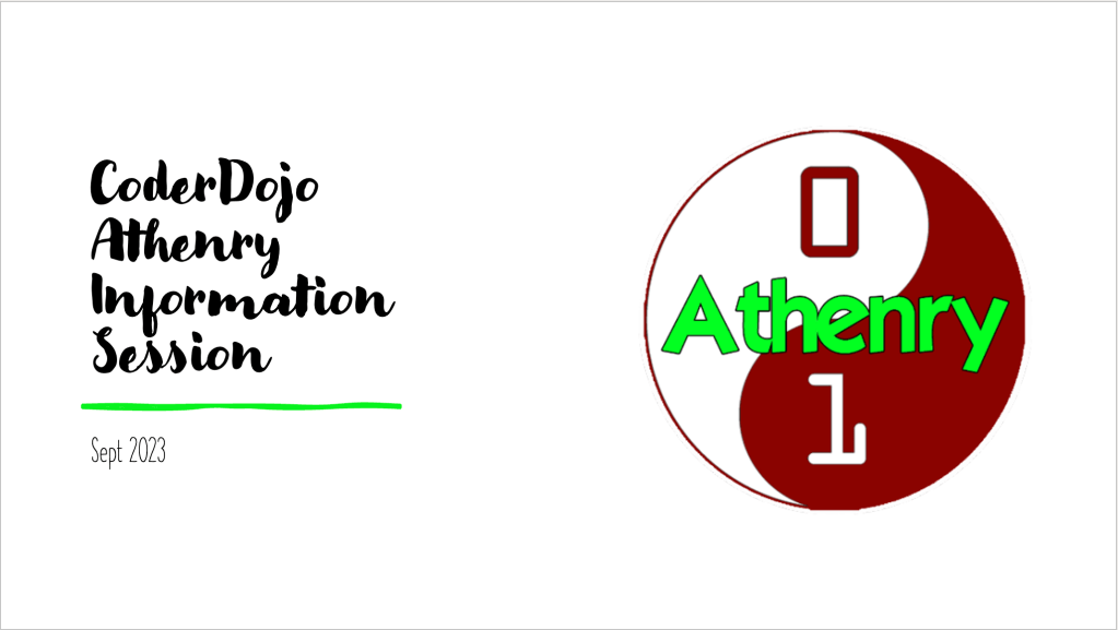 The introductory slides from this session can be found here: CoderDojo Athenry – Kick-Off Sept 2023.pptx