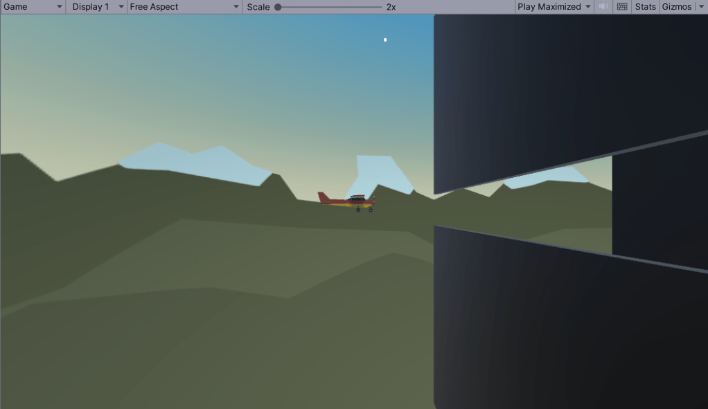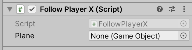 It has a property called Plane, but nothing’s assigned there. We can set this by dragging and dropping the plane from the hierarchy, or by clicking the small circle icon on the right above and picking the “Player” object from the pop-up list. Running and testing this shows that the camera now follows the plane, but it’s right on top of the plane. It needs to be some distance away. Examining the FollowPlayerX.cs script we see at the top there’s a private property called offset: