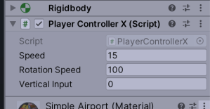The first two issues were that the plane was flying backwards and at great speed. The initial challenge was to identify what was making the plane move. Looking at the plane, called Player in the scene, in the inspector, we could see it has a script component called Player Controller X added to it.