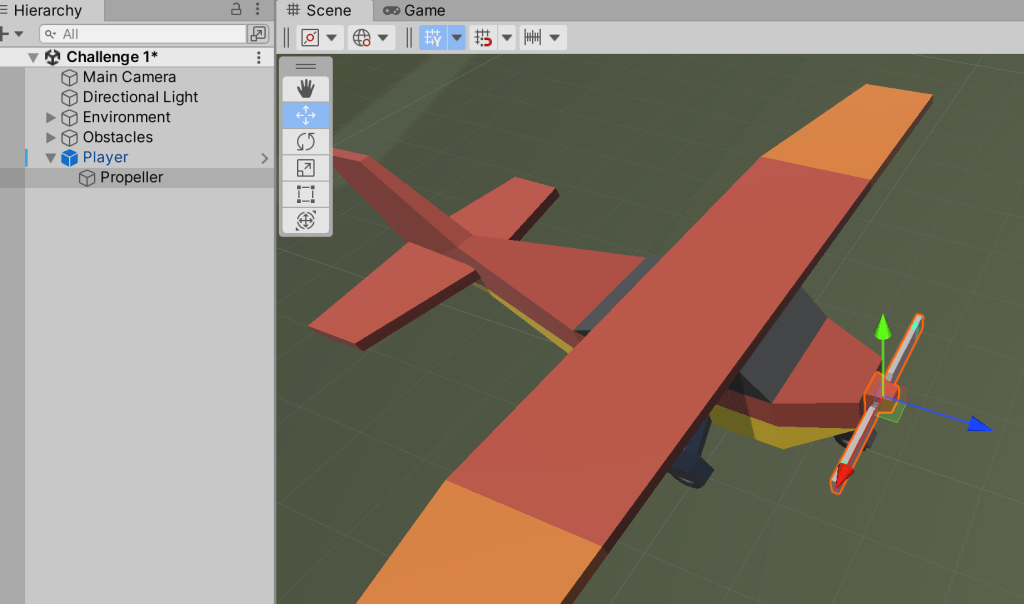 Note that although we’re moving the propellor ourselves, or at least rotating it, that doesn’t interfere with the fact that it’s moving with the plane, because it’s a child object.